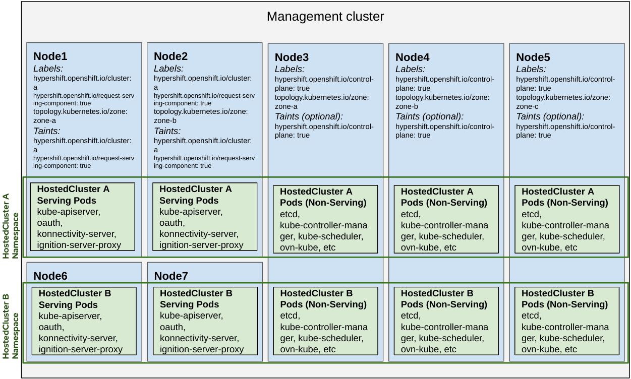 - Two nodes in different zones are dedicated to a specific hosted cluster’s front end serving components.