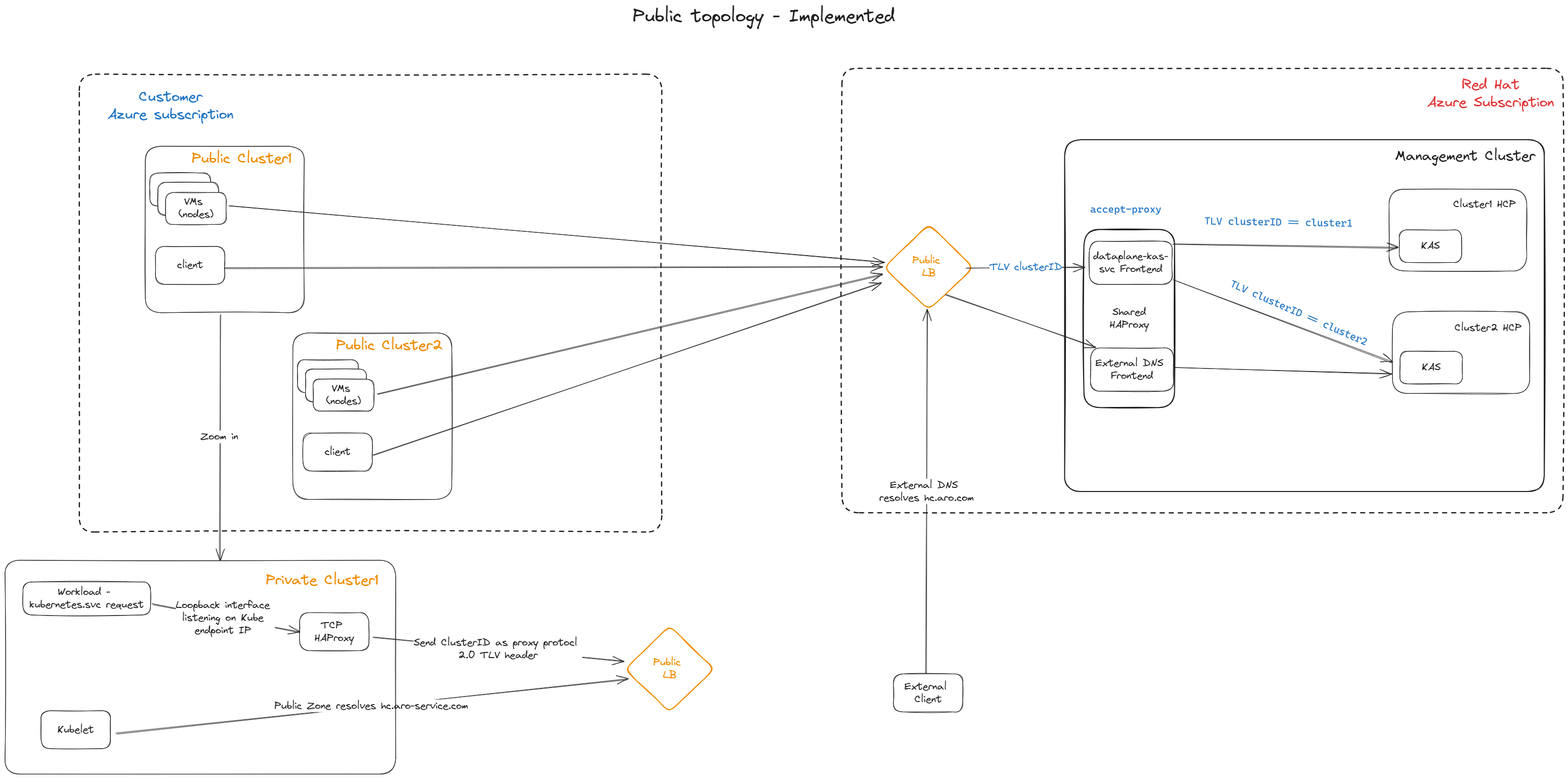 Shared Ingress (single LB) solution is able to differentiate between various hcp api-servers hosted on the mgmt cluster using the PROXY Protocol. The PROXY protocol enables adding additional info to a TLS connection, outside of the encrypted message, when both ends support this protocol. The fields that are added with the PROXY protocol are mainly: - Source IP - Source Port - Destination IP - Destination Port - TLVs (key-value pairs that carry arbitrary data)